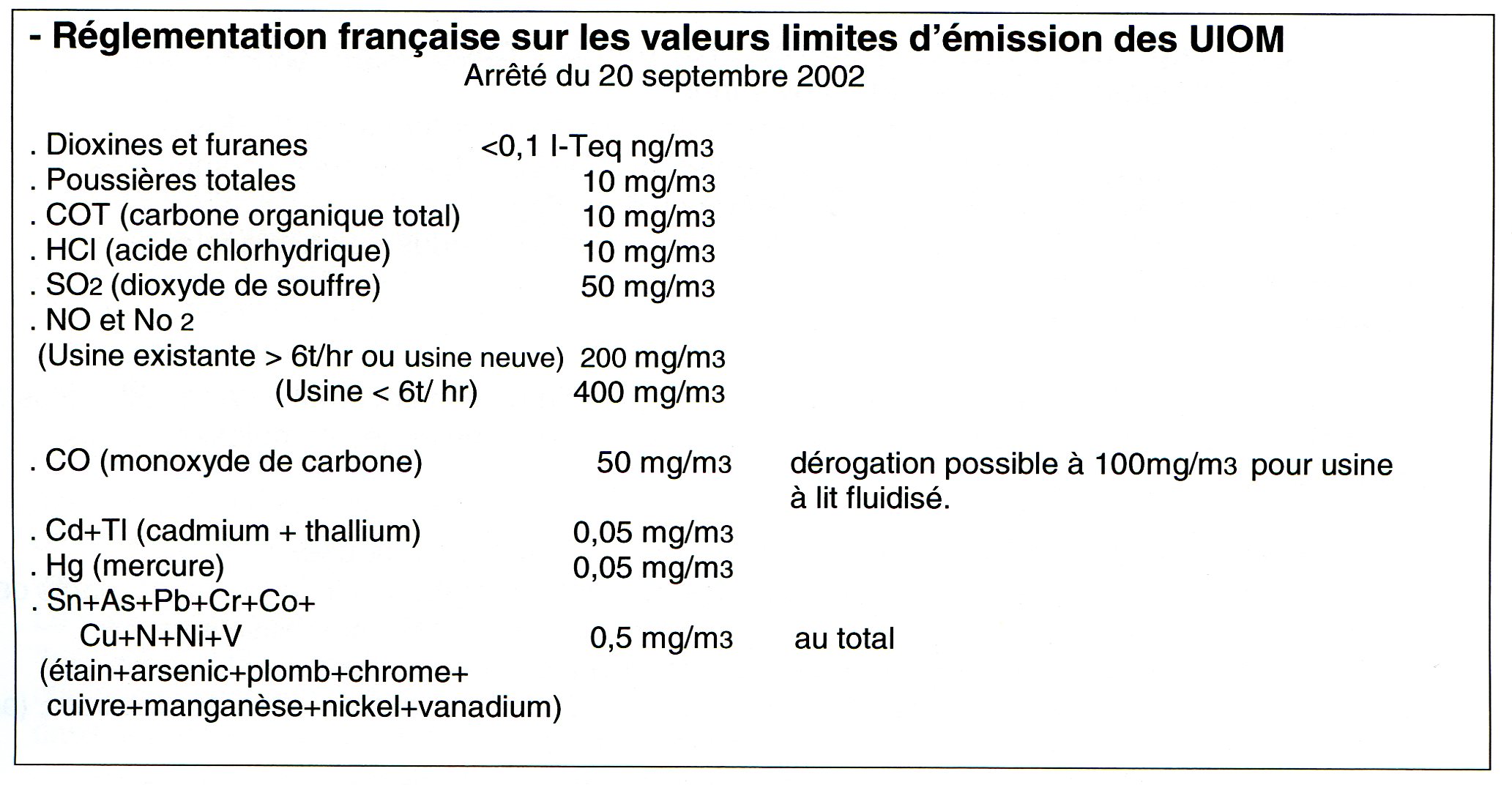 Compte tenu des problèmes sanitaires posés par la présence de ces matériaux dans un procédé thermique, toute une série de réglementations, de plus en plus contraignantes, a vu le jour. La première concerne la limitation des poussières dans les fumées. Un dispositif d’amélioration a été la mise en place par l’installation de filtres : électro filtres, ou/et filtres à manches. Ce dispositif permet de capter poussières et particules de métaux lourds solides. Mais cela n’empêche pas certains métaux volatiles incorporés dans des circuits imprimés et autres produits similaires d’être évacués avec les fumées.Ces rejets dans les fumées d’incinérateurs d’O.M. (REFIOM) se retrouvent également en moindres quantités dans les mâchefers.
