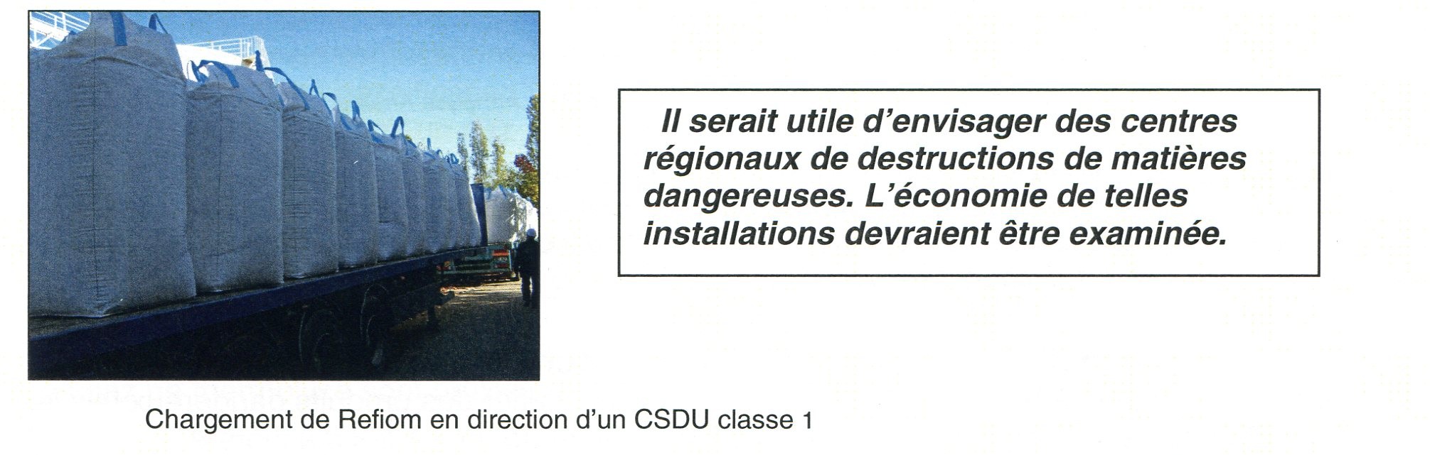 Nous jugeons indispensable l’inertage effective des REFIOM. Leur accumulation et leur conservation par des liants tels que le ciment ne sont pas satisfaisantes. Leur raffinage et la récupération des métaux devenus rares devront être envisagés.